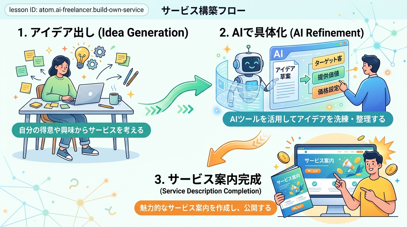 このレッスンでは、あなたが持っているスキルやアイデアを「売れるサービス」のかたちにまとめる方法を学びます。AI ツールに手伝ってもらいながら、サービスの中身・料金・案内ページ・受付手段の 4 つを一気に整えます。