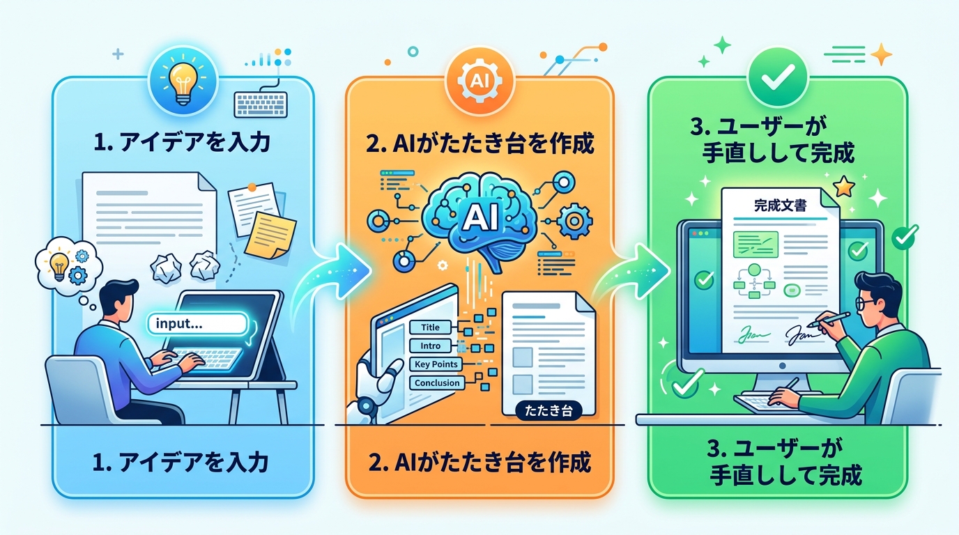 料理にたとえると、この段階は「どんな料理を作りたいか、材料は何があるか」を書き出すステップです。AIは渡された情報が多いほど的確な下書きを返してくれます。