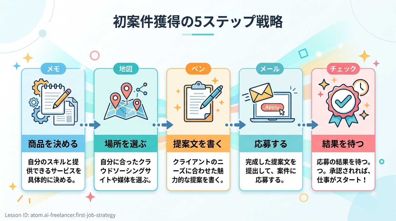 お疲れさまでした! この Atom を終えると、あなたは「最初の1件を取るための具体的な手順」を理解し、AIツールを使って提案文を作り、実際に応募できるようになります。次の Atom では、採用率を上げるためのプロフィール作りを学びます。