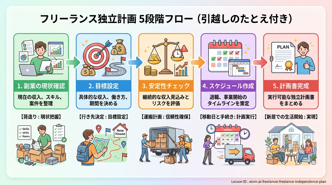 このレッスンでは、AIチャットを相棒にして、15分で「副業から独立への移行計画書」を1枚つくり上げることをゴールにします。完成した計画書は、引っ越しの段取り表のようなもの。独立という大きな決断を、数字とスケジュールで「見える化」します。