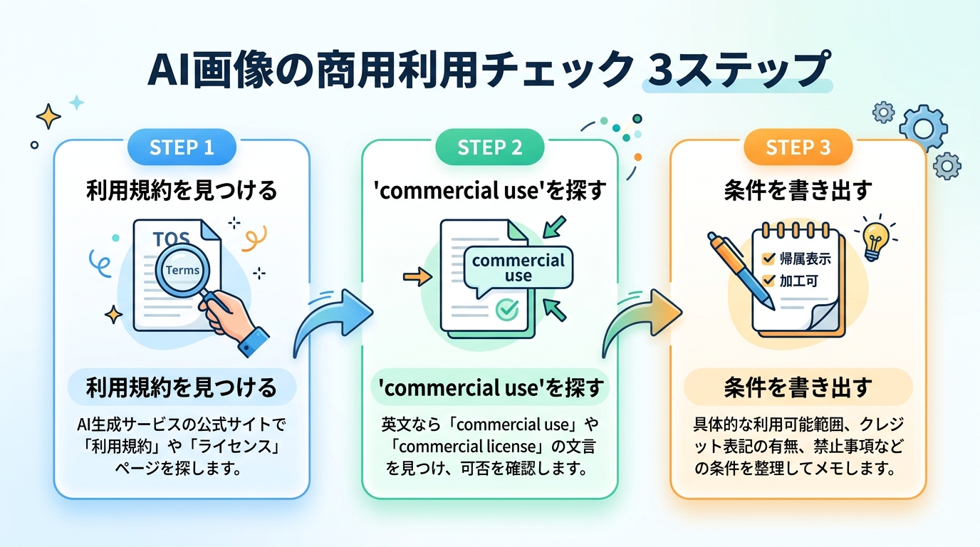- ❌ 悪い例: 「SNSで『商用利用OK』と見かけたので、そのまま使うことにした」(公式規約を確認していない)
