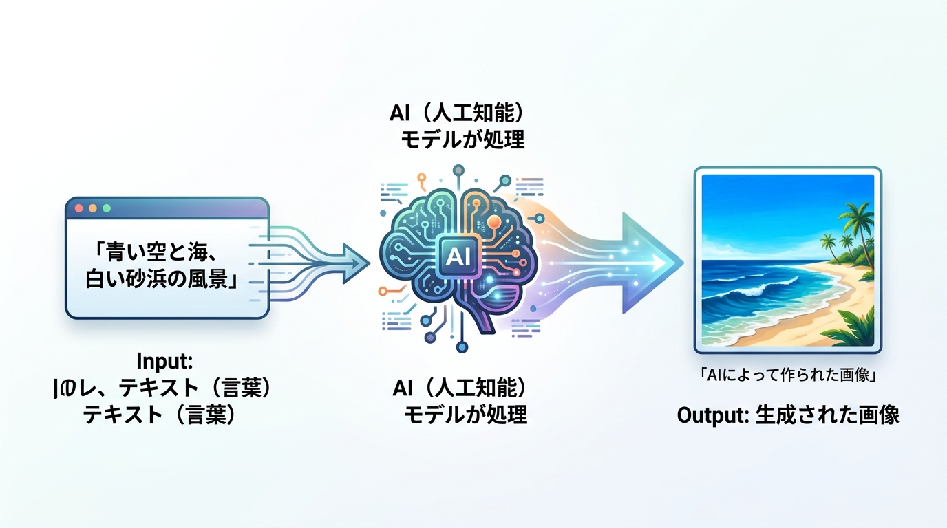 料理にたとえると、レシピのようなものです。「材料」(どんな絵が描きたいか)と「調理方法」(どんなスタイルで描きたいか)をAIに伝えると、あっという間に完成写真のような画像を出してくれます。このレッスンが終わる頃には、あなたは自分の言葉でAIに画像を作らせることができるようになります。