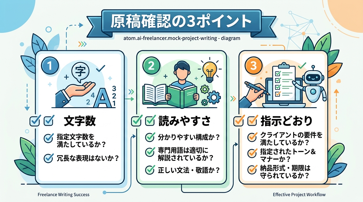 - 原稿をチェック・修正した — 文字数・読みやすさ・指示どおりかの3点で確認した