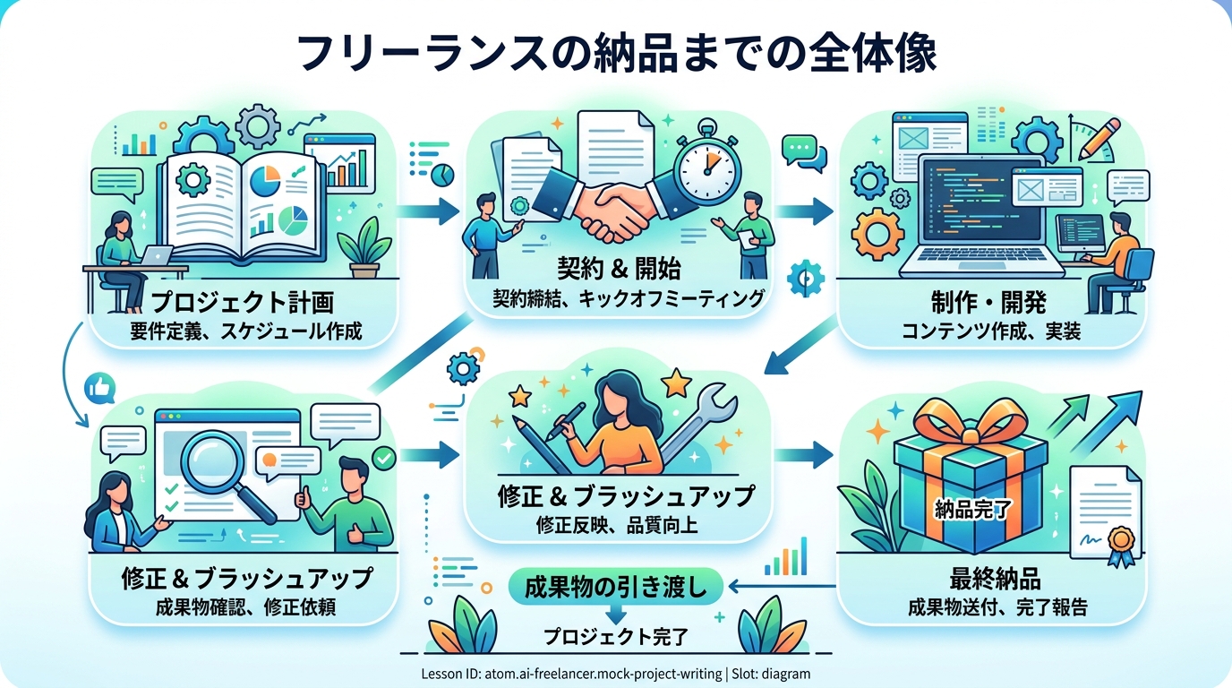 これは、スポーツの「練習試合」のようなものです。本番の試合(=実際のクライアントからの依頼)に出る前に、試合形式の練習をして流れを体に覚えさせるイメージです。この1回の模擬案件をやりきるだけで、「自分にもできそうだ」という手応えが得られます。