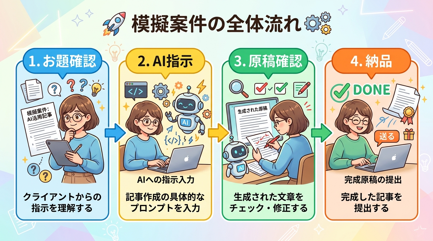 この4ステップが、実際のライティング案件の基本パターンです。今回の模擬案件をやりきったあなたは、もう本番の案件でも同じ流れで進められます。