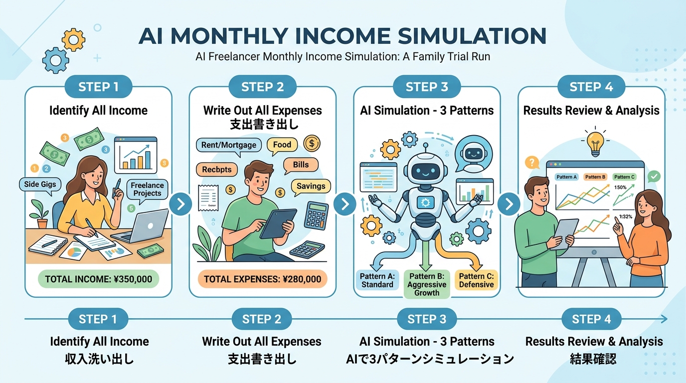 収入と支出がそろったら、いよいよシミュレーションです。家計の「お試し運転」だと考えてください。実際に1か月走る前に、ガソリン(収入)が足りるか、通行料(支出)はいくらかを確認するイメージです。
