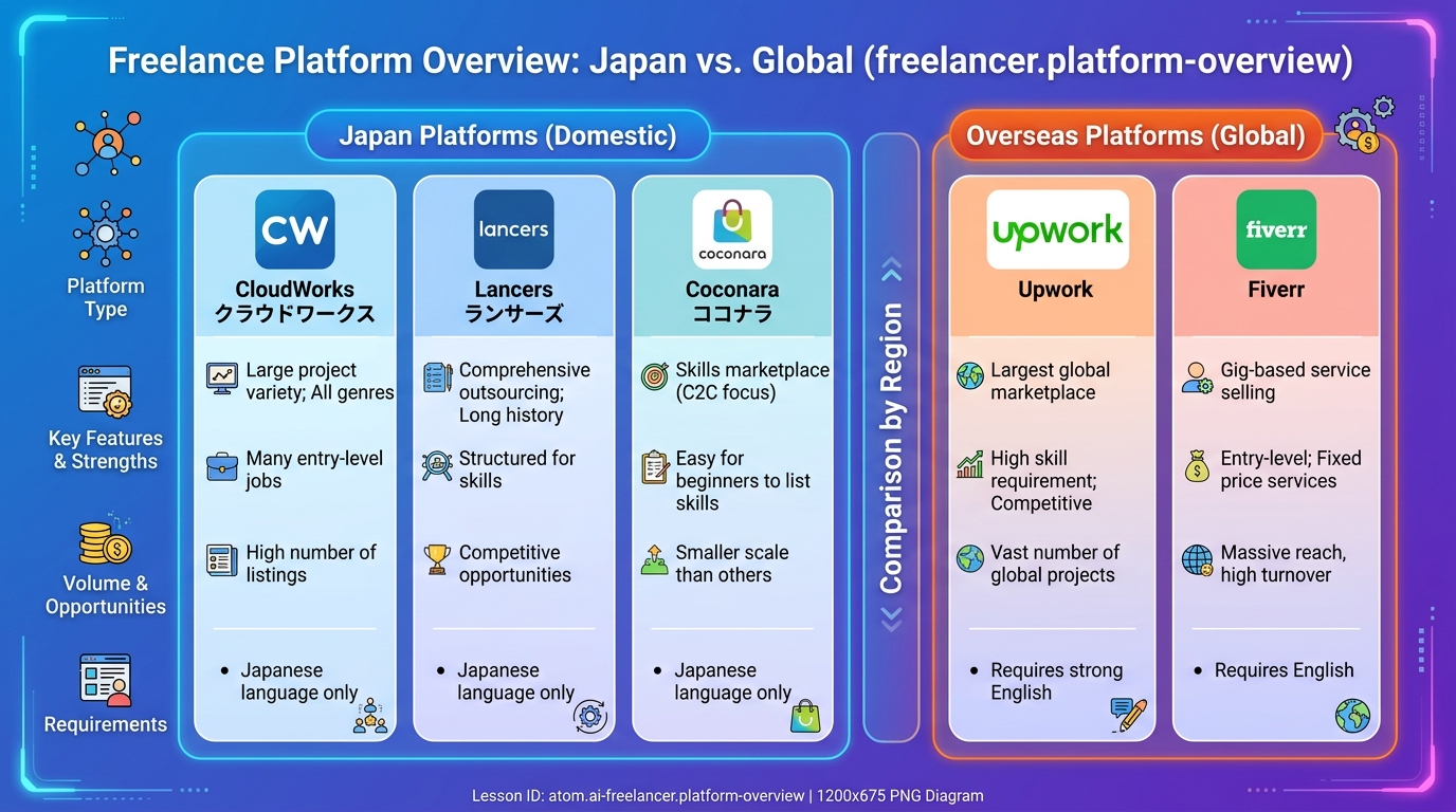 各プラットフォーム(クラウドワークス、ランサーズ、ココナラ、Fiverr、Upwork)の