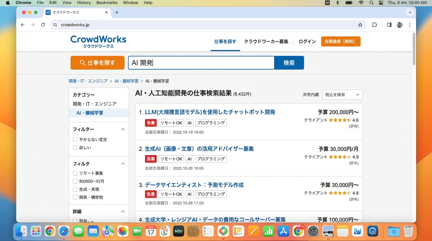 - AI関連の案件数を確認する — サイト内で「AI」「ChatGPT」と検索して、どれくらい案件があるか見てみましょう