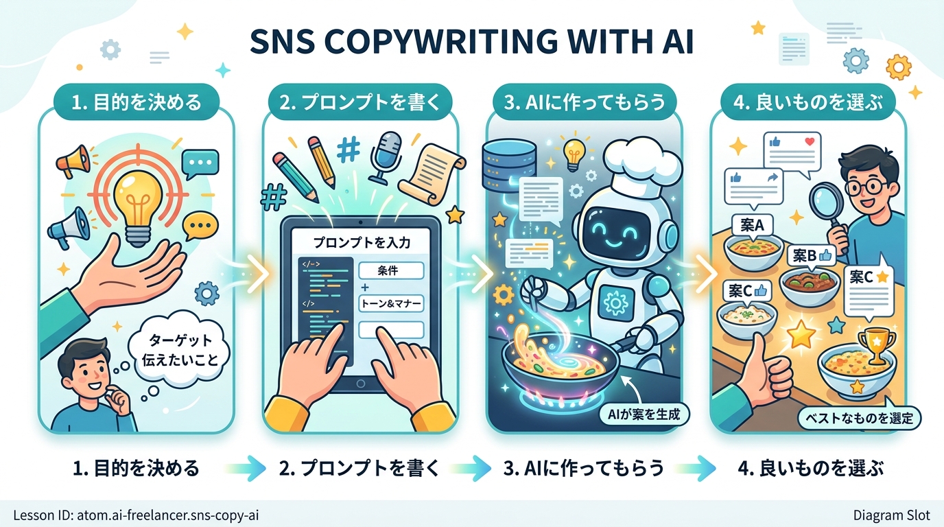 おめでとうございます!これで「AIにSNSコピーを作ってもらう」スキルが身につきました。次は画像生成やSEO記事など、AIに頼める仕事の幅を広げていきましょう。