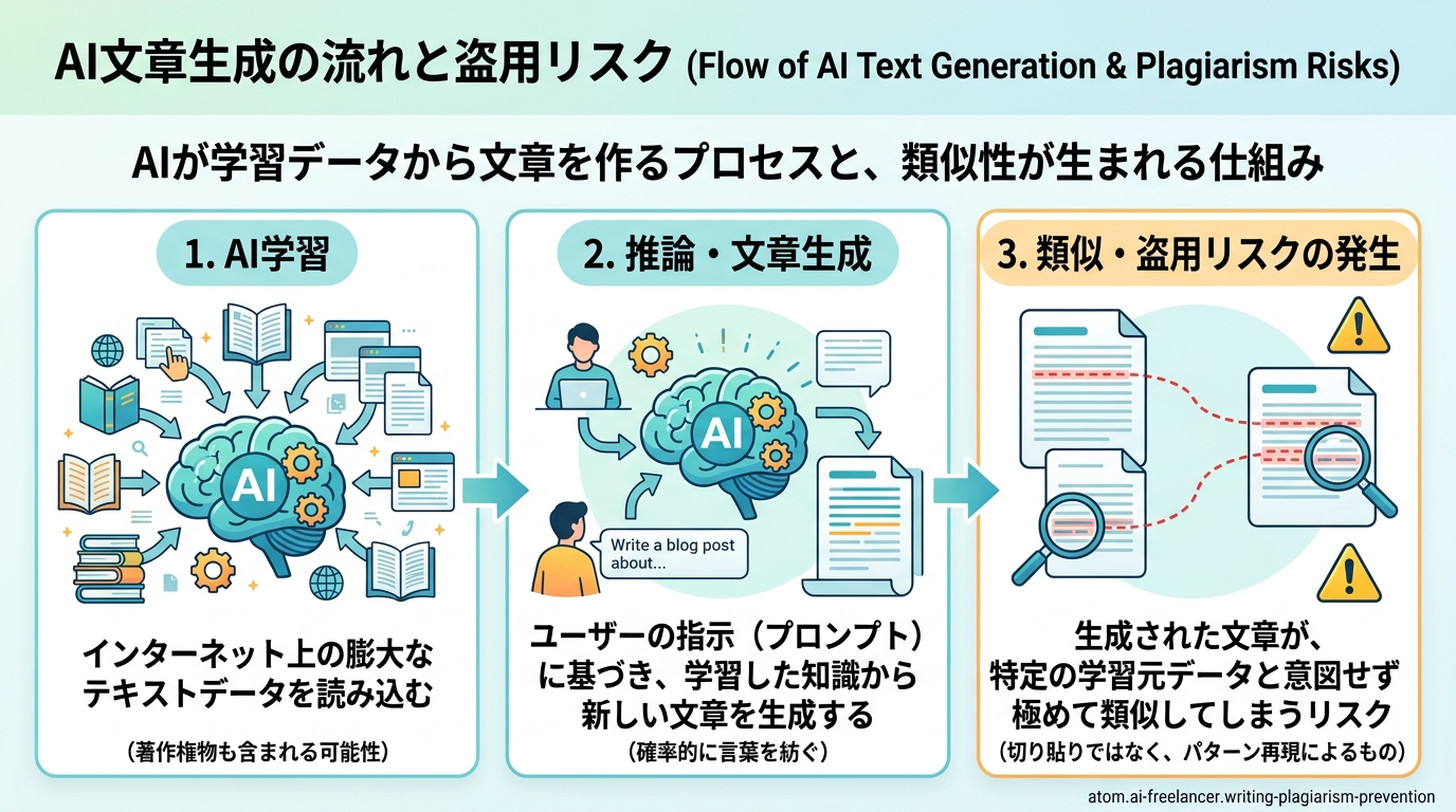 AIはインターネット上の膨大な文章を読んで学習し、それをもとに文章を作ります。だからこそ、出力された文章が誰かが書いた文章と似てしまうことがあります。