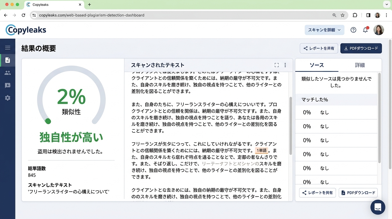 - 「AI検出」と「盗用検出」は別物です: AI検出は「AIが書いたかどうか」を調べるもの。盗用検出は「他の文章と似ているか」を調べるもの。このレッスンで重視するのは盗用検出のほうです。クライアントから「AI検出に引っかからないように」と言われた場合は別のレッスンで扱います