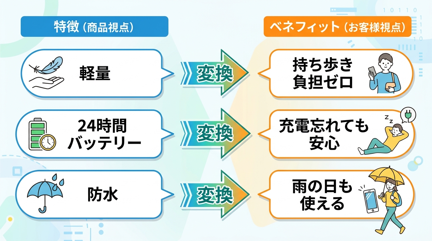 - ベネフィット:お客様が「どうなるか」「何を感じるか」というお客様にとっての価値