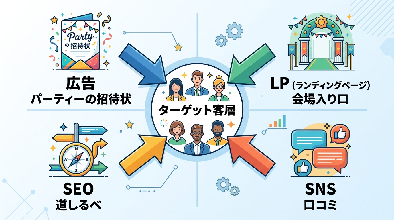 | 4チャネルの違いが分からない | 基礎知識が不足 | AIに「広告・LP・SEO・SNSの違いを、パーティーのたとえで説明して」と聞く |