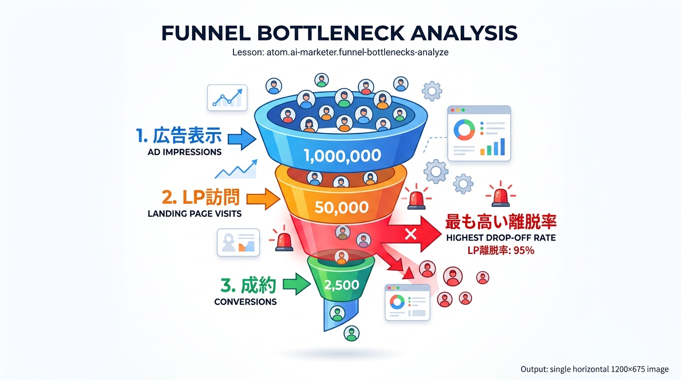 以下の広告ファネルデータを分析し、ボトルネック(最大の課題)を特定してください。