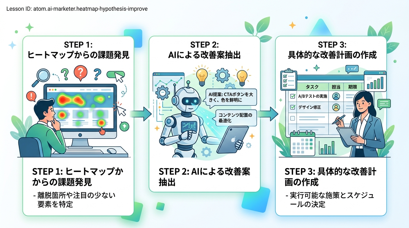 ヒント: ヒートマップのスクリーンショットをAIに画像として貼り付けると、さらに的確な回答が返ってきます。ChatGPTやClaudeは画像を読み取れるので、「この画像はLPのヒートマップです。気になる点と改善案を教えてください」と一言添えるだけでOKです。
