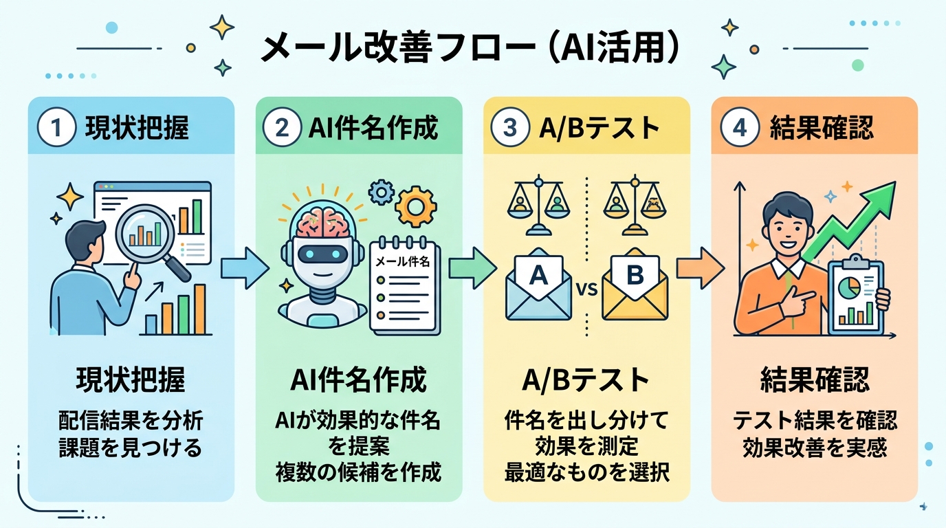 大事なコツ: 件名と本文を同時に変えると、「どちらの変更が効いたのか」が分かりません。最初は件名だけ変えて比較しましょう。