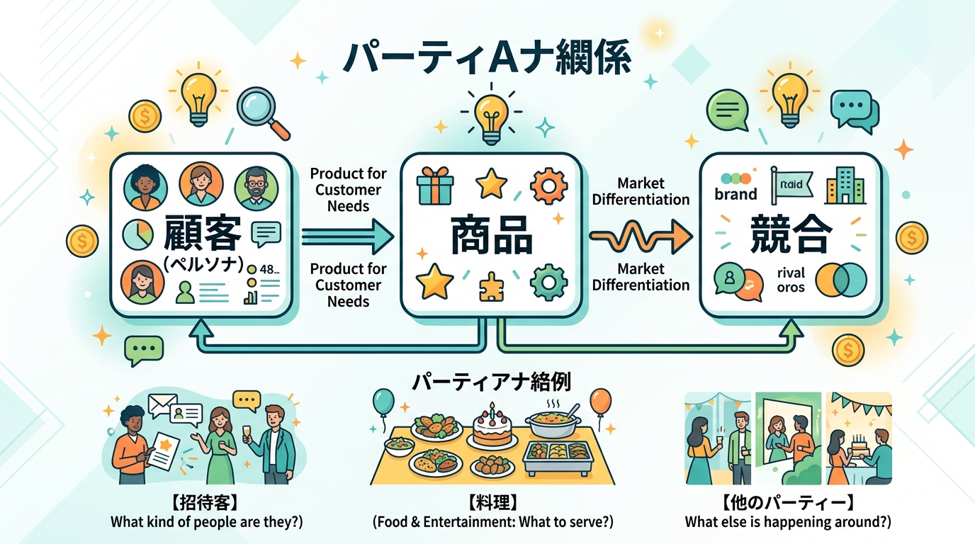 顧客・商品・競合を整理する パーティーを開くとします。 誰を呼ぶか (=顧客) 何を出すか (=商品) 同じ日に行われる他のパーティーは何か (=競合) この 3 つを知らないと、せっかくのパーティーも人は集まりま...