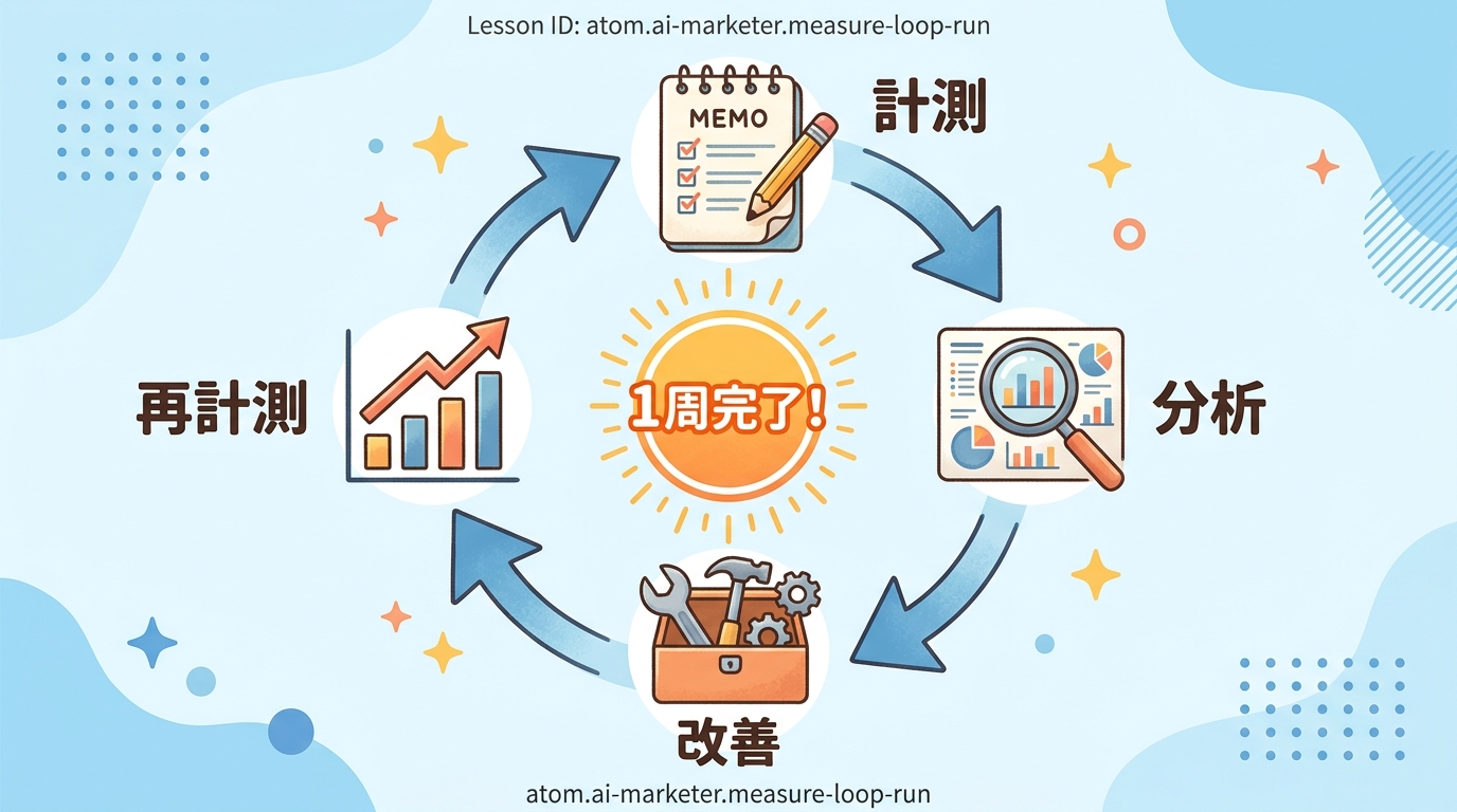 このレッスンでは、あなたが自分のマーケティング活動で計測 → AI分析 → 改善 → 再計測の1周分のループを回せるようになります。所要時間は約15分です。