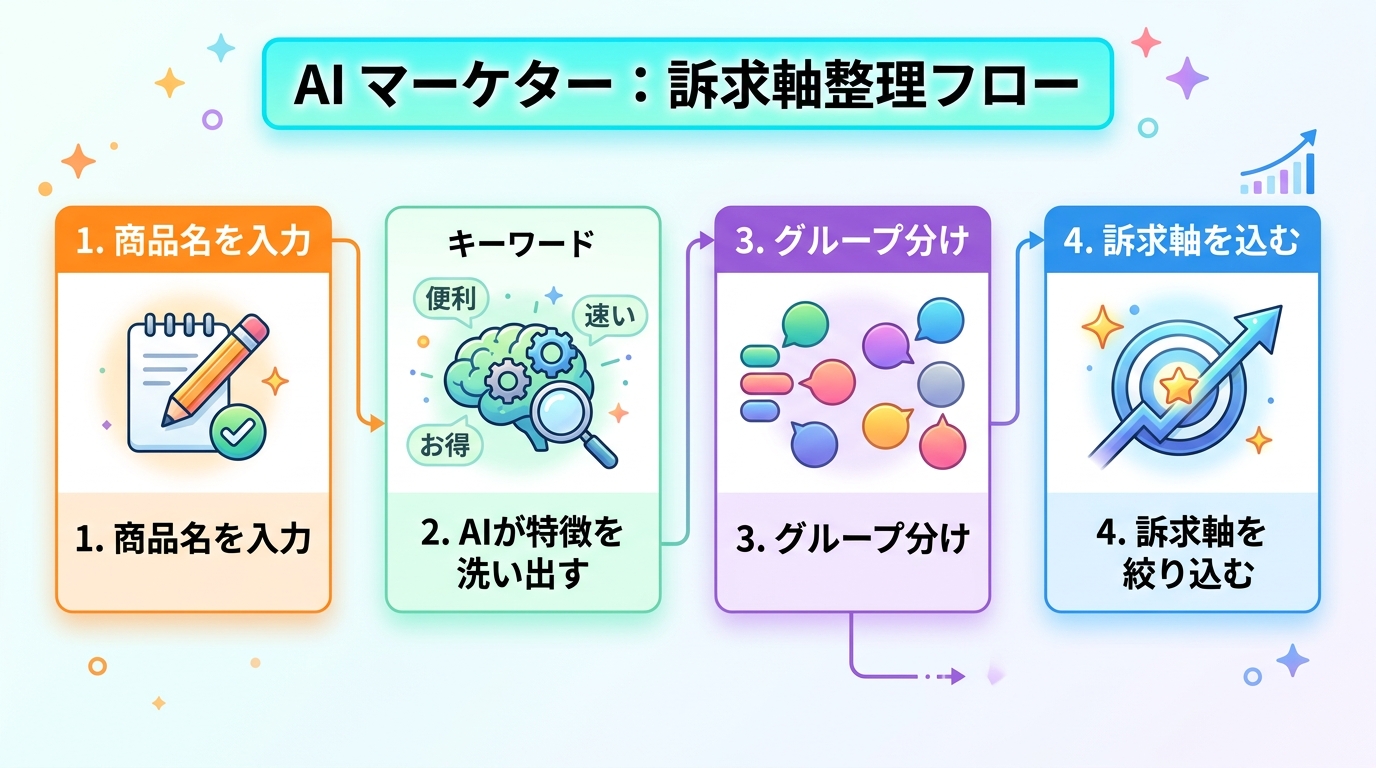 訴求軸を整理する 商品やサービスには、いろいろな「見せ方」があります。 たとえば料理を例に考えてみましょう。 同じ「おにぎり」でも—— 手軽さ を強調する:「走りながら食べられる」 素材の良さ を強調する:「新潟産...