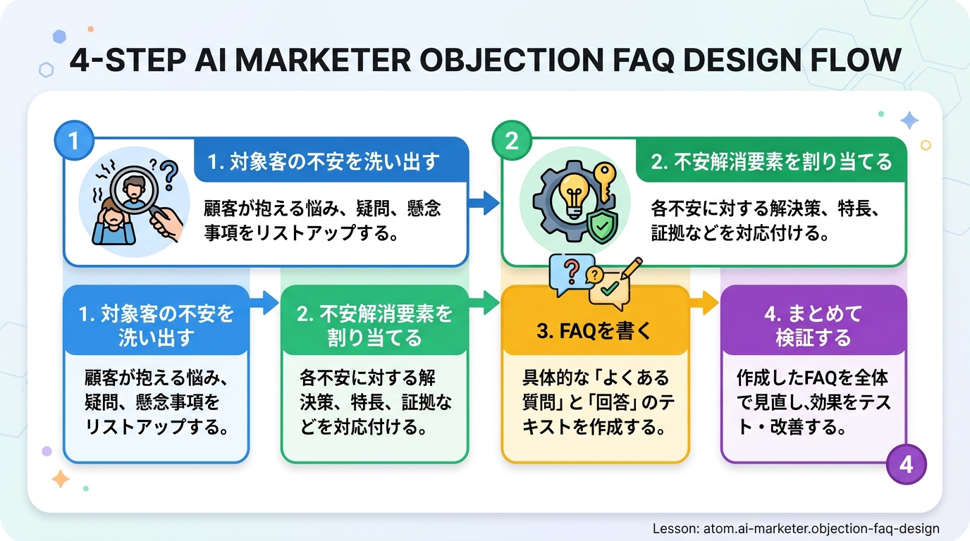 Webサイトや販売ページでも同じことが言えます。お客さんが「本当に大丈夫かな?」と感じる不安に、あらかじめ答えを用意しておくことで、購入や申し込みのハードルがぐっと下がります。このレッスンでは、AIツールを活用して、その「不安を解消する要素」と「よくある質問(FAQ)」を設計します。