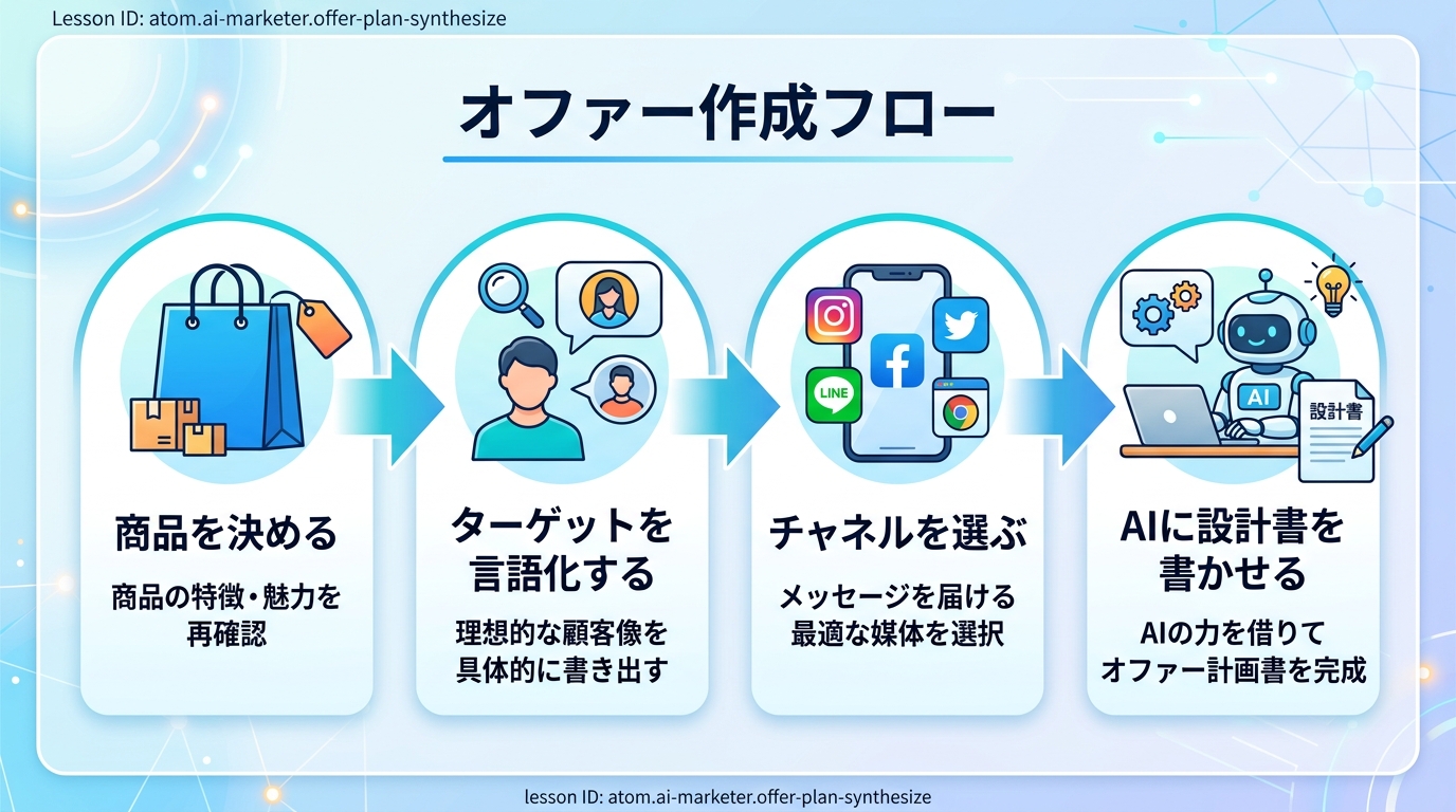この Atom では、AI チャットツール(ChatGPT や Claude など)を使って 1つの商品の集客設計書 を15分で仕上げます。 完成すると「自分の商品を、誰に・どうやって届けるか」が1枚の書類にまとまった状態になります。
