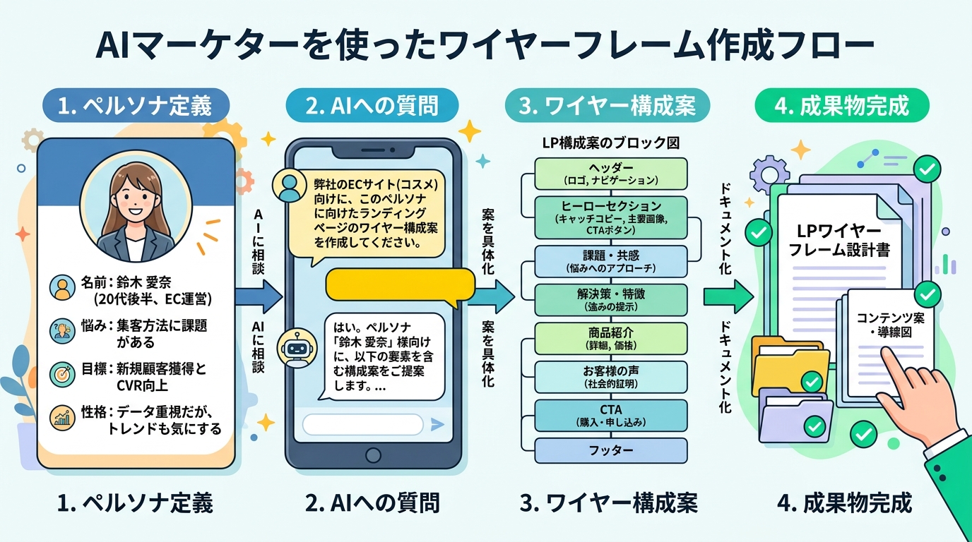 このレッスンでは、あなたのサービスの「こういう人に届けたい」という人物像(=ペルソナ)ごとに、Webページの設計図(=ワイヤー)をAIツールでつくる方法を学びます。完成すると、ペルソナの悩みと目標に合ったページ構成が1枚の文書になります。