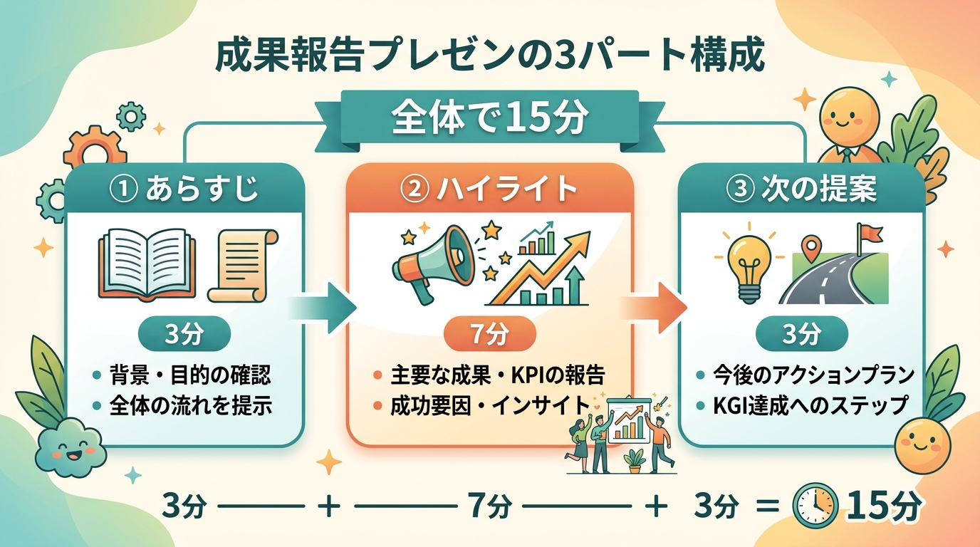 成果報告のプレゼンは、次の3パートで組み立てます。