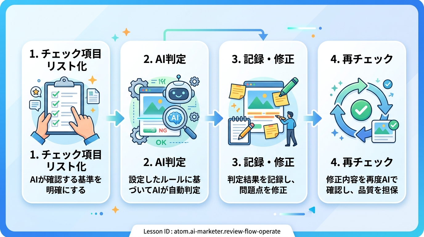 このレッスンでは、AIチャットツール(ChatGPT や Claude など、質問すると文章で答えてくれるサービス)を使って、あなたが作った広告文が法律に触れていないかをチェックする「フロー(=一連の手順の流れ)」を組み立て、実際に運用できるようになります。