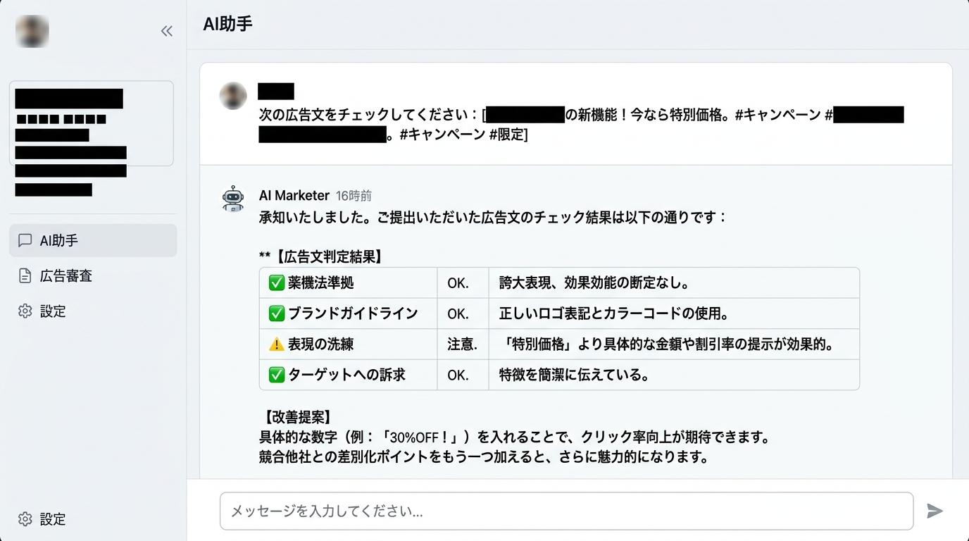 大事な注意: AIによるチェックは「下書き段階のスクリーニング(ふるい分け)」です。重要な広告や判断に迷う場合は、必ず法務担当者や弁護士など専門家に相談してください。