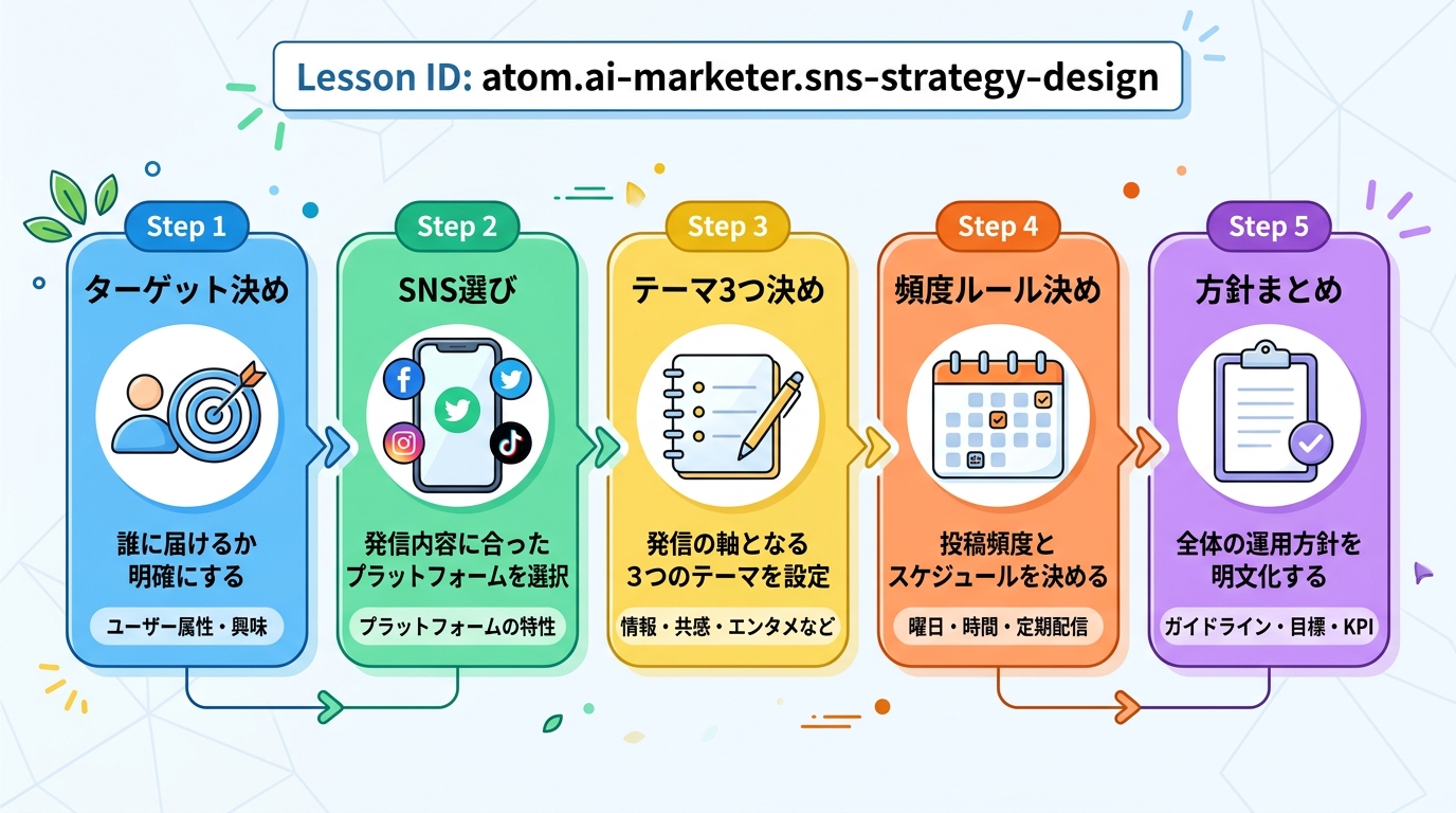 SNS運用方針を設計する あなたのビジネスや活動をSNSで広めたいけれど、「何を」「どこで」「どれくらいの頻度で」発信すればいいのか迷っていませんか? このレッスンでは、AIチャット(ChatGPTやClaude)...