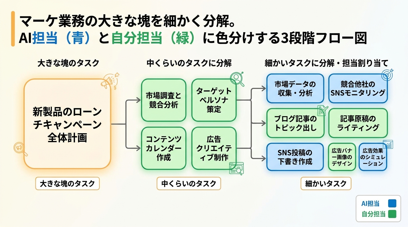 マーケティングの業務も同じです。「SNSの運用をする」を細かく分けて、AIに任せられる部分を見つけていきましょう。