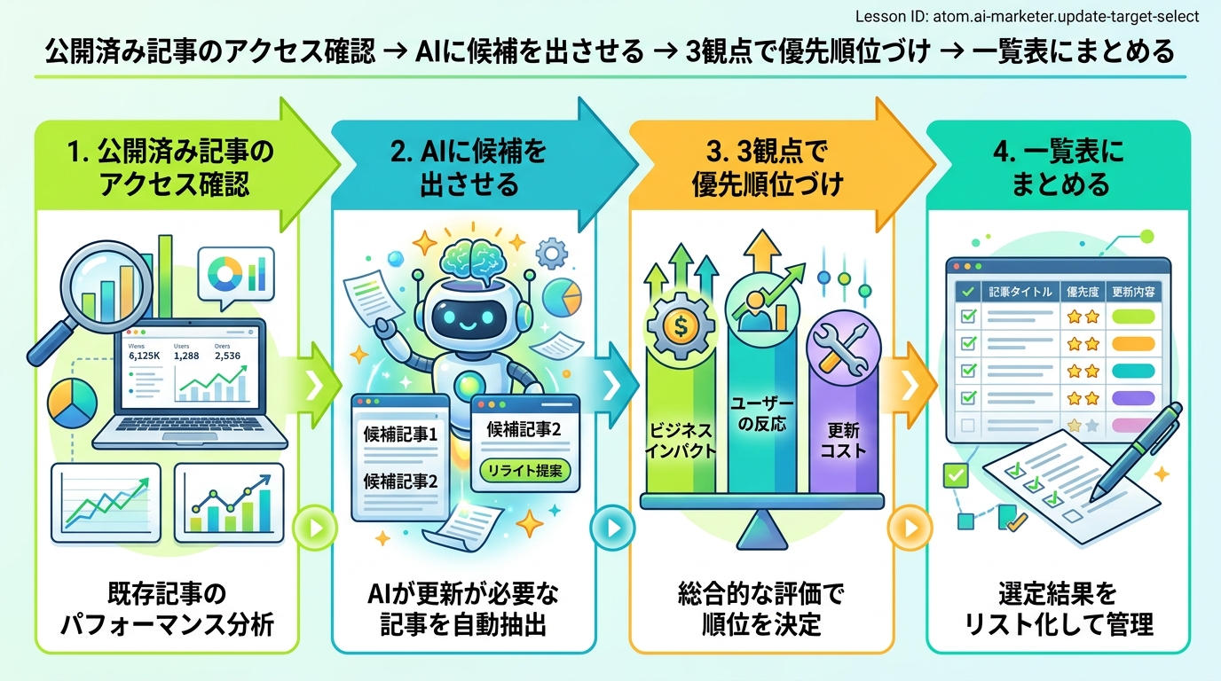 お疲れさまでした!候補一覧ができたら、次はこの中から実際にリライトに取り組むステップに進みましょう。