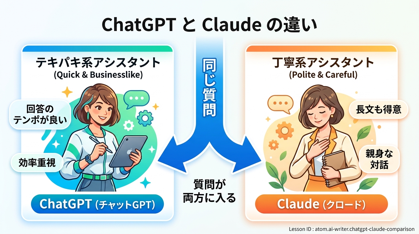 このレッスンを終えると、あなたは「ChatGPT」と「Claude」という2つのAI(=人工知能のチャットツール)の得意・不得意を自分の言葉で説明でき、「この作業にはこっちを使おう」と目的に応じて選べるようになります。最後に、あなた専用の使い分けメモを1枚つくるのがゴールです。