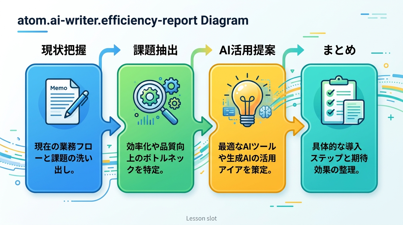 執筆効率化レポートを作成する レストランのメニューを考えてみましょう。冷蔵庫にある食材、調理にかかる時間、お客さんに見えやすいレイアウト——これらを一枚の「今日のメニュー表」にまとめますよね。 執筆効率化レポートも...