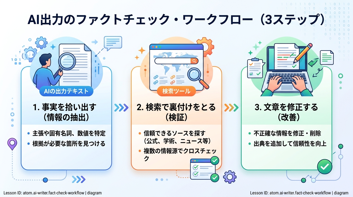 上の図は、このレッスンで学ぶファクトチェックの流れ(AI出力 → チェックポイント抽出 → 検索で裏取り → 修正)を示しています。