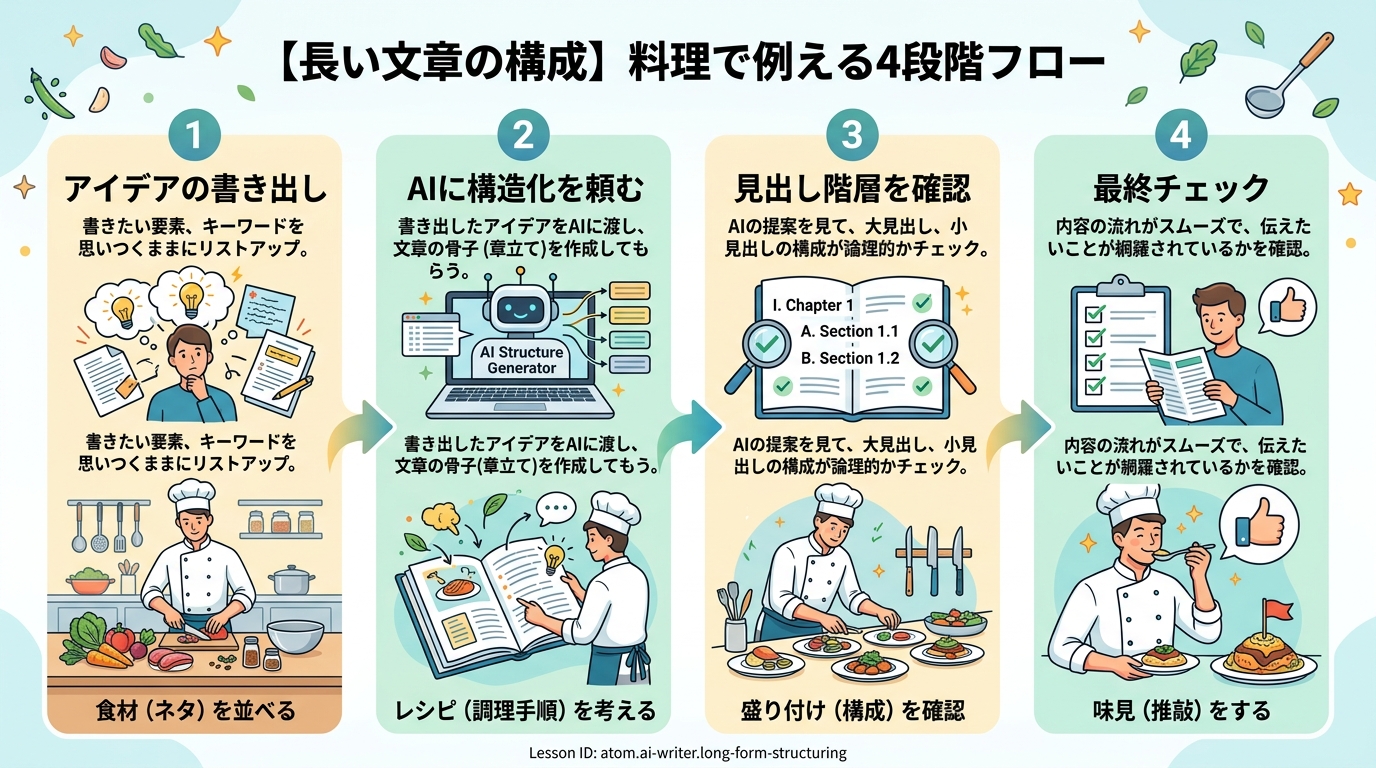 このレッスンを終えると、あなたは長い文章を書く前に、全体の「骨組み」をAIと一緒に整理して作れるようになります。