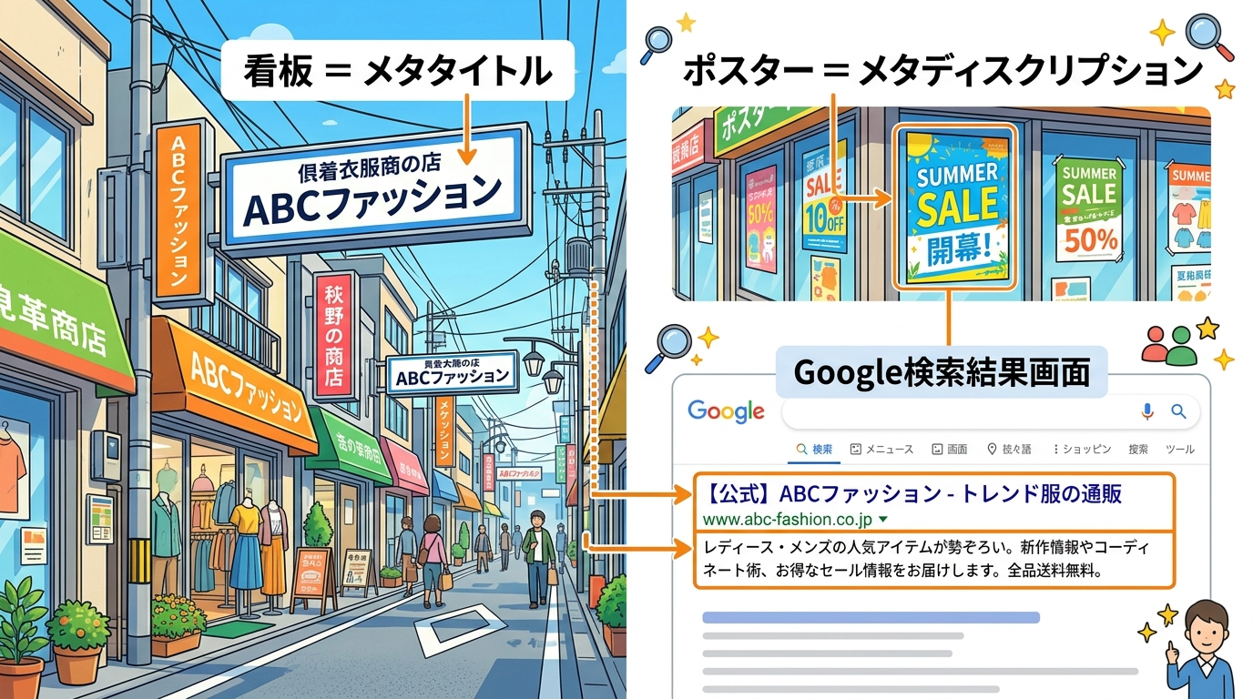 - 入り口のポスター(メタディスクリプション)— 店の入り口に貼ってある紹介文。「こんな商品がありますよ」と伝える
