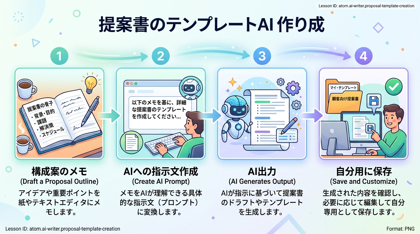 このレッスンでは、AIを「優秀なアシスタント」として使い、いつでも使い回せる 提案書のテンプレート(=ひな形) を15分で作ります。完成したテンプレートは、あなた専用の「型紙」として何度でも再利用できます。