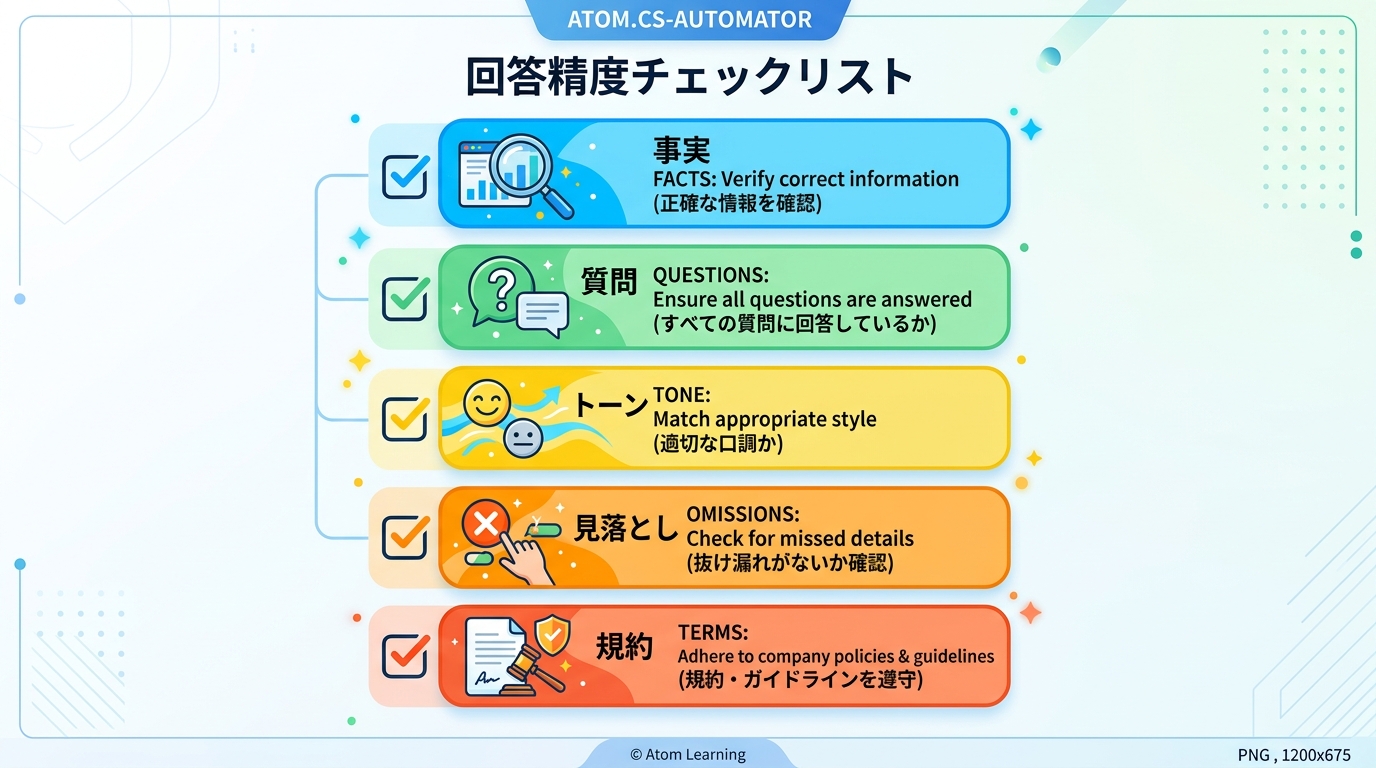 - 5つの確認項目(事実・質問対応・トーン・見落とし・規約)がすべて含まれている