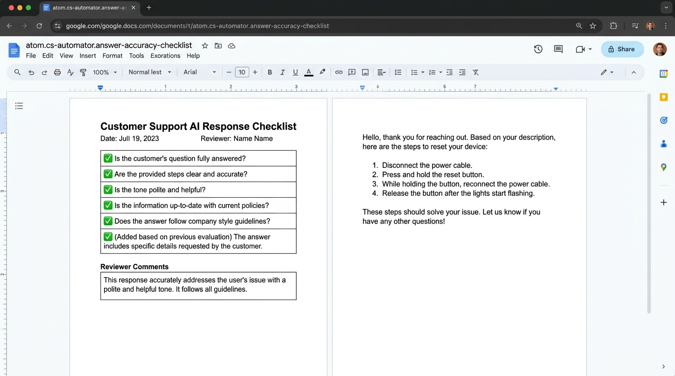 カスタマーサポートで AI が生成した回答の精度を確認するチェックリストを作ってください。