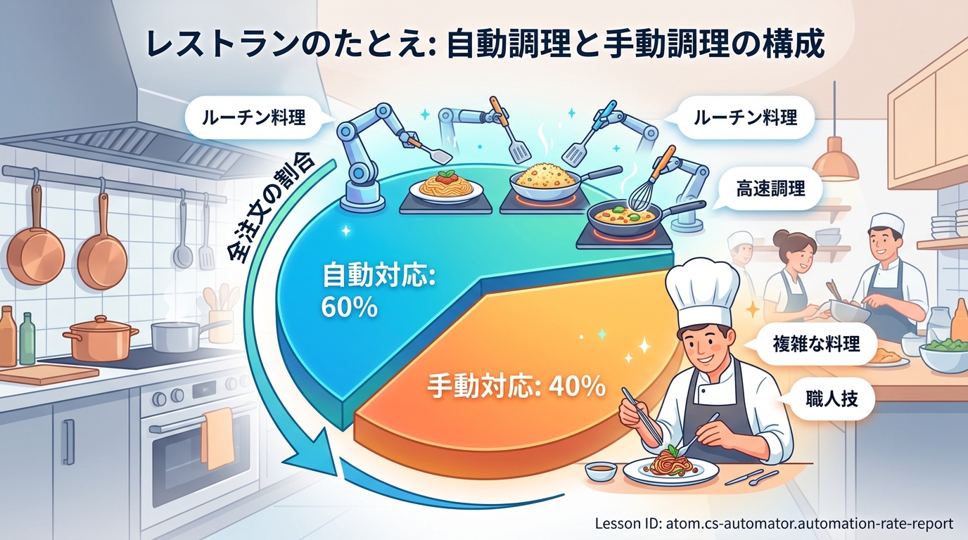 レストラン全体の料理のうち「自動調理器だけで完成した割合」が、カスタマーサポートでいう自動化率にあたります。自動化率が高いほど、スタッフは複雑な問い合わせに集中できるようになります。