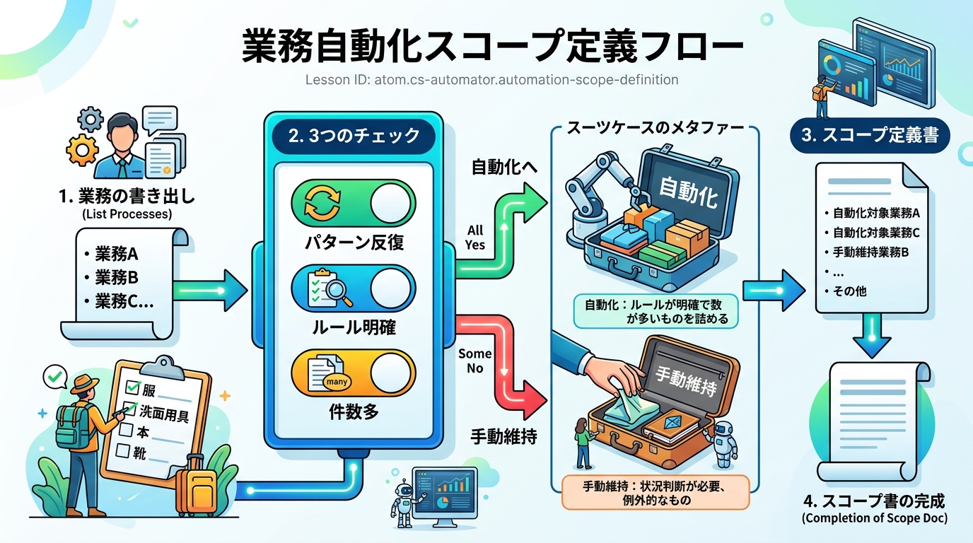 このAtomでは、あなたが現在のカスタマーサポート業務の中から自動化に向くものと向かないものを分類し、最終的に「自動化スコープ書」という1枚のドキュメントを作ります。所要時間は15分程度です。