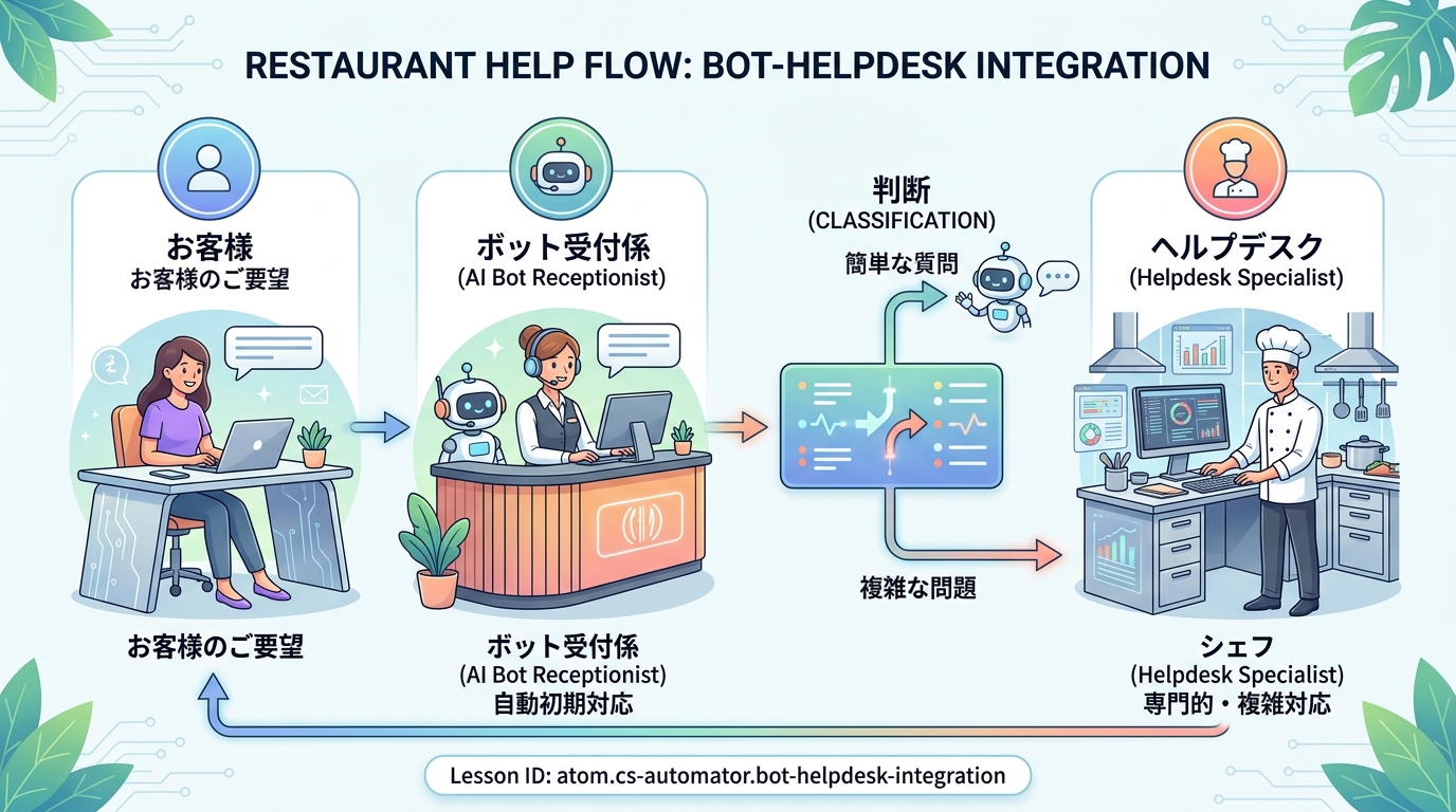 レストランで例えてみましょう。お店には「自動応答の受付係(ボット)」と「キッチンのシェフ(ヘルプデスクの担当者)」がいます。受付係が一人で解決できるお客様もいれば、シェフにバトンタッチしなければならない注文もあります。