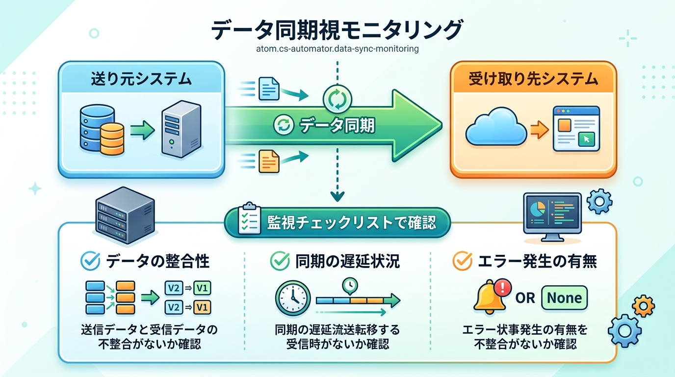 たとえば、料理のレシピを見ながら作るとき、「火加減は大丈夫かな?」「時間は経ちすぎていないかな?」と要所要所で確認しますよね。データ同期の監視も同じで、放っておくと気づかないうちにデータがズレてしまい、お客さまへの対応に支障が出ることがあります。