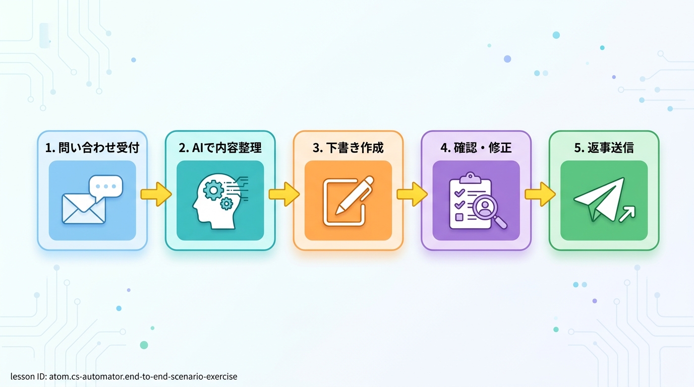 問い合わせ受付から解決まで通しで演習する レストランの注文を思い出してみましょう。お客さんが注文を伝え、店員さんが厨房に伝え、料理ができたらテーブルに届ける——この一連の流れは「カスタマーサポート(=お客さんからの...