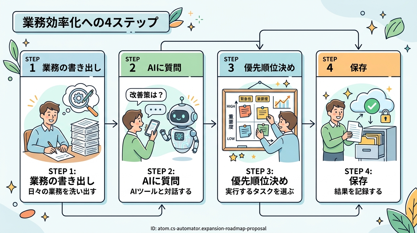 | AIの提案がピンとこない | 業務リストに頻度(毎日/週1回など)と所要時間を追記してから、もう一度AIに聞いてみましょう |