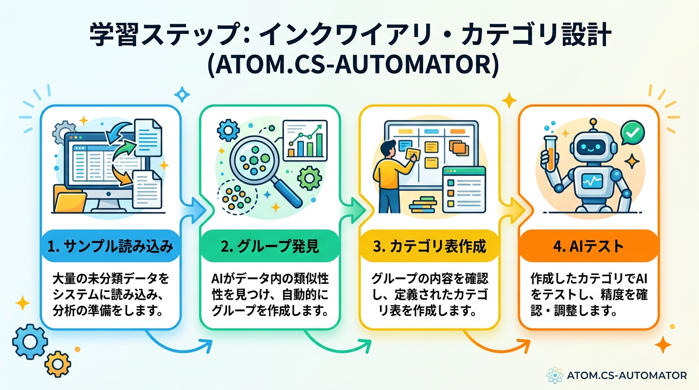 完成イメージ: カテゴリ名・説明・代表例が並んだ表(3〜8行)を作り、AIに試し分類させて精度を確認するところまで進めます。