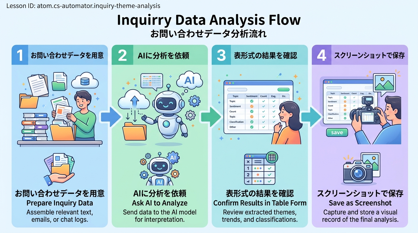 画像ファイルを分かりやすい名前(例:inquiry-analysis-2024-01.png)で保存してください。これがこのレッスンの成果物(=あなたが作った証拠)です。