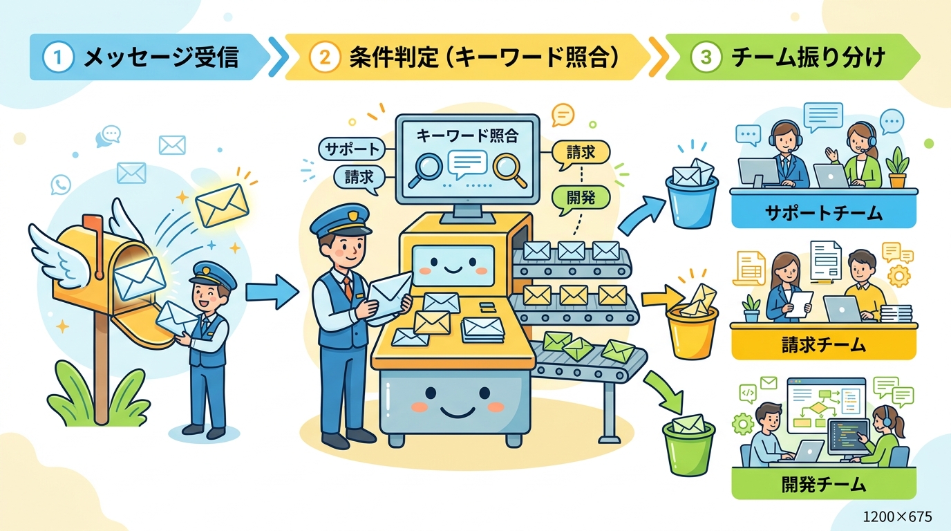 自動振り分けルールは、この仕分け係と同じ役割です。メッセージの内容をチェックし、「これはテクニカルチーム」「これは請求チーム」と自動で振り先を決めてくれます。あなたがやるのは、仕分け係に「こういうメッセージはこのチームね」と指示を出すこと——それがルール設定です。