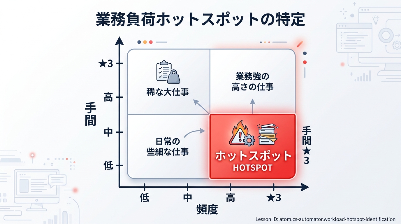 この Atom では、あなたの業務を「食品カッターに任せられる作業」と「自分で味見すべき作業」に分ける力を育てます。その結果として、AI に任せる価値が一番高い業務負荷(=ホットスポット)を1つ特定することがゴールです。